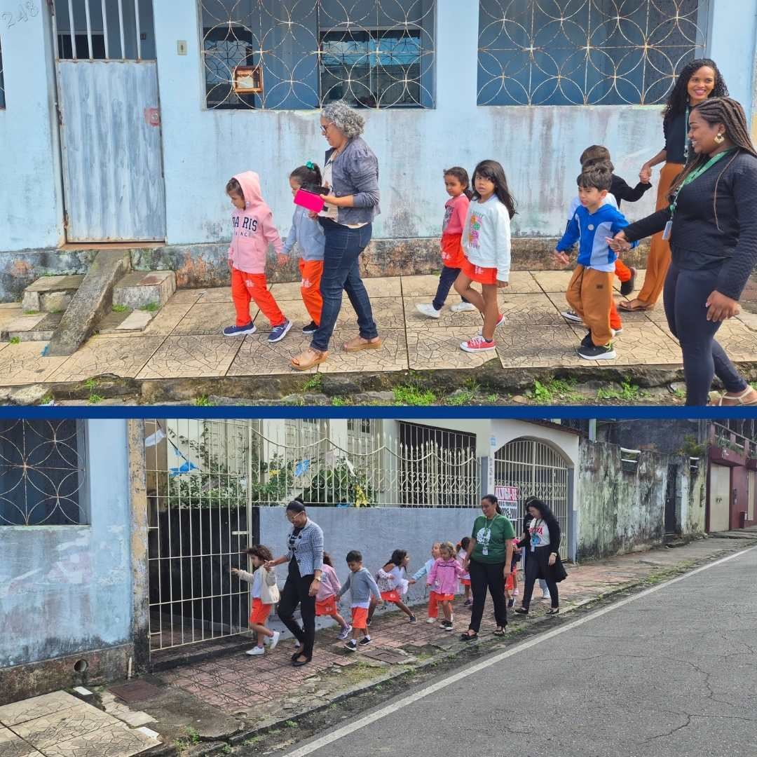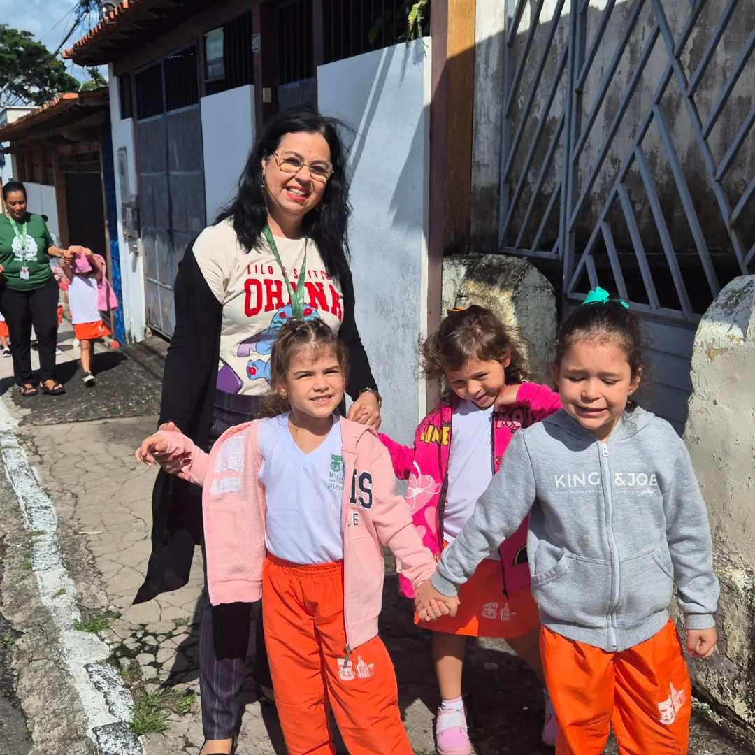 Durante o trajeto, elas foram estimuladas a observar a limpeza das ruas, a natureza, as diferentes construções e aprender sobre cuidados importantes ao caminhar na rua. Foi um momento de muita curiosidade e aprendizado prático!