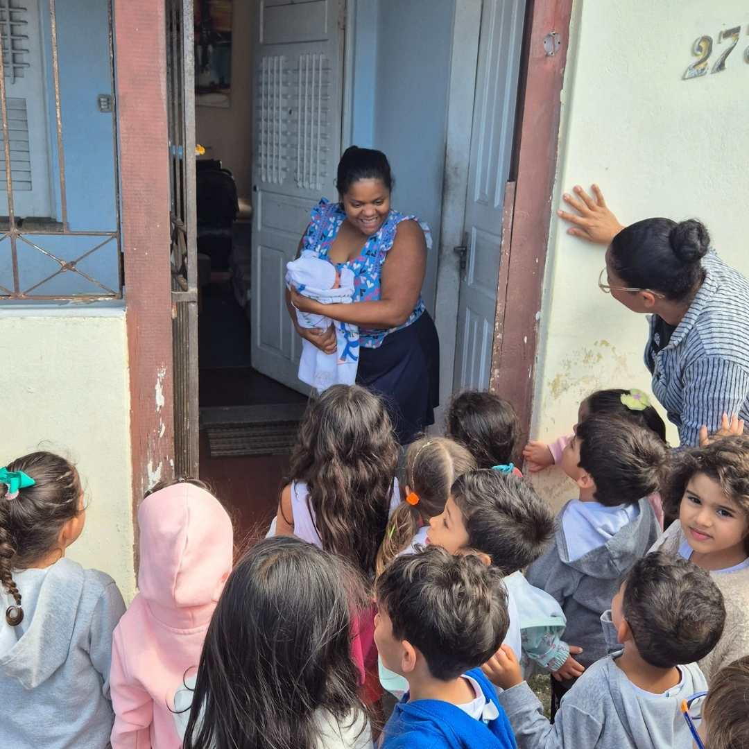 E para tornar o dia ainda mais especial, tivemos uma grata surpresa: as crianças conheceram — mesmo que de longe — o Saulo, filhinho da nossa querida Tia Naty, que está afastada por conta da sua licença maternidade.
